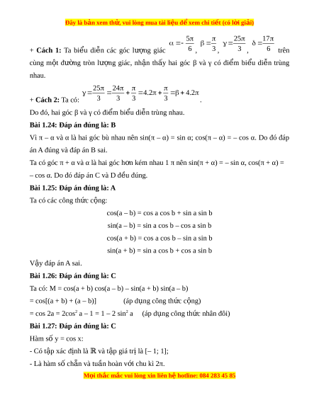 Đây là bản xem th , vu ử i lòng mua tài li u ệ đ xe ể m chi ti t (c ế ó l i ờ gi i ả ) 5 25 17 + Cách 1: Ta bi u ể di n ễ các góc lư ng ợ giác 6 , 3 , 3 , 6 trên cùng m t ộ đư ng ờ tròn lư ng ợ giác, nh n ậ th y
