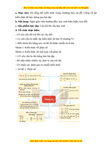 d. Tổ chức thực hi n ệ : - GV yêu c u H ầ S trả l i ờ các câu h i ỏ : + Gv yêu c u hs ầ nhắc l i ạ ki n t ế h c ứ đã h c ọ ở chư ng ơ VI + Mỗi nhóm lên b ng t ả reo sơ đ đã ồ đư c chu ợ n b ẩ ị nhà ở Nhóm 1: Ki n t ế h c v ứ phân s ề ố Nhóm 2: Ki n t ế h c v ứ t ề ính toán v i ớ phân số + GV yêu c u hs ầ lên b ng ả làm bài t p ậ - HS ti p nh ế n ậ nhi m ệ v , đ ụ a r ư a câu tr l ả i ờ : - GV nh n