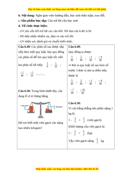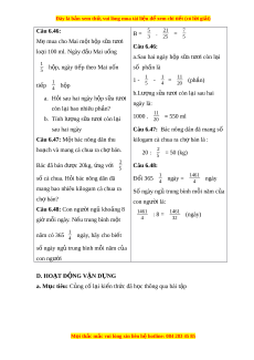 Số ngày ngủ trung bình mỗi năm c a ủ ch bán? ợ con ngư i ờ là: Câu 6.48: Con ngư i ờ ng kho ủ ng ả 8 1461 : 8 = 1461 (ngày) gi m ờ i ỗ ngày. N u t ế rung bình m t ộ 4 32 1 năm có 365 ngày, hãy cho bi t ế 4 số ngày ng t ủ rung bình mỗi năm c a ủ con ngư i ờ D. HOẠT Đ N Ộ G VẬN D N Ụ G a. Mục tiêu: C ng c ủ ố l i ạ ki n ế th c đã h ứ c t ọ hông qua bài t p ậ M i ọ thắc m c