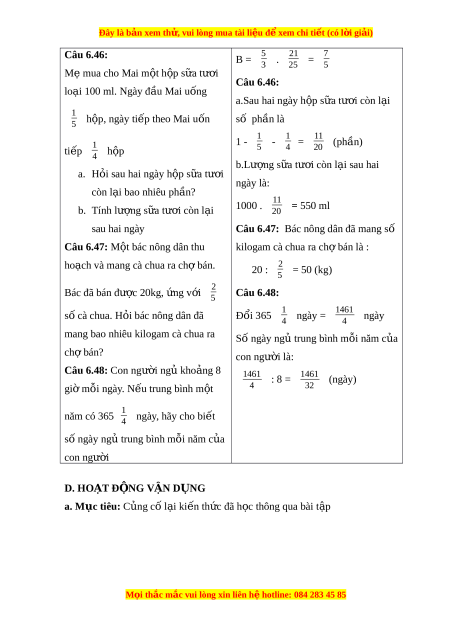 Đây là bản xem th , vu ử i lòng mua tài li u ệ đ xe ể m chi ti t ế (có l i ờ gi i ả ) Câu 6.46: 5 21 7 B = . = 3 25 5 Mẹ mua cho Mai m t ộ h p s ộ ữa tư i ơ Câu 6.46: lo i ạ 100 ml. Ngày đ u M ầ ai u ng ố a.Sau hai ngày h p s ộ a t ữ ư i ơ còn l i ạ 1 h p, ngày t ộ i p t ế heo Mai uốn số phần là 5 1 1 11 1 - - = (phần) ti p ế 1 h p ộ 5 4 20 4 b.Lư ng ợ s a ữ tư i ơ còn l i ạ sau hai a. H i ỏ sau hai ngày h p s ộ ữa tư i ơ ngày là: còn l i ạ bao nhiêu ph n? ầ 11 b. Tính lư ng ợ s a t ữ ư i ơ còn l i ạ 1000 . = 550 ml 20 sau hai ngày