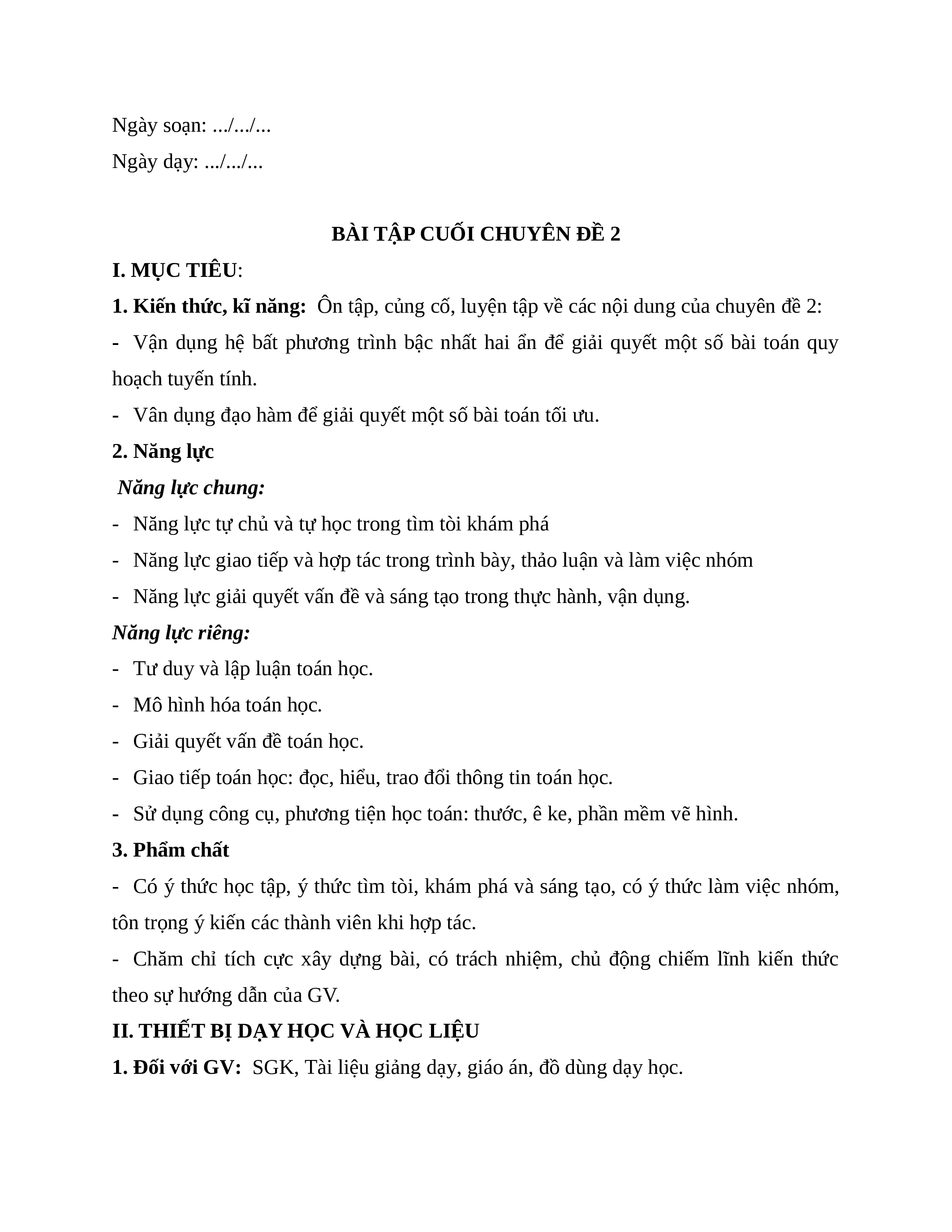 BÀI TẬP CUỐI CHUYÊN ĐỀ 2 I. MỤC TIÊU: