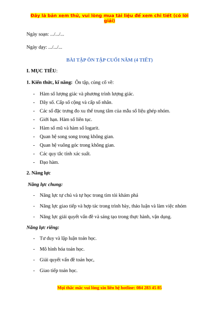 BÀI TẬP ÔN TẬP CUỐI NĂM (4 TIẾT) I. MỤC TIÊU: