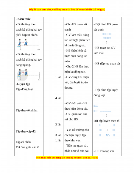 - Kiến thức. - Đi thường theo - Cho HS quan sát - Đội hình HS quan vạch kẻ thẳng hai tay tranh sát tranh phối hợp tự nhiên. - GV làm mẫu động tác kết hợp phân tích kĩ thuật động tác. - HS quan sát GV - Hô khẩu lệnh và - Đi thường theo làm mẫu thực hiện động tác vạch kẻ thẳng hai tay mẫu dang ngang. - HS tiếp tục quan sát - Cho 2 HS lên thực hiện lại động tác. 1 lần - GV cùng HS nhận -Luyện tập xét, đánh giá tuyên Tập đồng loạt dương. - Đội hình tập luyện đồng loạt. 4 lần - GV thổi còi - HS ----------- Tập theo tổ nhóm thực hiện động tác. ----------- - Gv quan sát, sửa sai cho HS. ĐH tập luyện theo tổ 3 lần Tập theo cặp đôi - Y,c Tổ trưởng cho