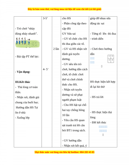 2 lần - GV và HS nhận xét - Chơi theo hướng đánh giá tuyên dẫn - Bài tập PT thể lực: 1 3 dương. 2 4 - GV nêu tên trò 4- 5’ chơi, hướng dẫn cách - Vận dụng: chơi, tổ chức chơi thở và chơi chính III.Kết thúc HS thực hiện kết hợp thức cho HS. - Thả lỏng cơ toàn đi lại hít thở - Nhận xét tuyên thân. dương và sử phạt - Nhận xét, đánh giá - HS trả lời người phạm luật chung của buổi học. - Cho HS bật tại chỗ Hướng dẫn HS Tự hai tay chống hông ôn ở nhà - HS thực hiện thả 10 lần - Xuống lớp lỏng - Yêu cầu HS quan - ĐH kết thúc sát tranh trả lời câu hỏi BT1 trong sách. - GV hướng dẫn - Nhận xét kết quả, ý