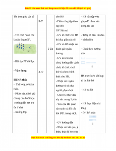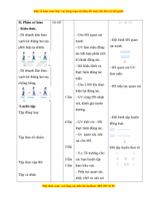 Phương pháp, tổ chức và yêu cầu Nội dung T. S. Hoạt động GV Hoạt động HS gian lần I. Phần mở đầu 5 – 7’ Nhận lớp Gv nhận lớp, thăm Đội hình nhận lớp hỏi sức khỏe học sinh phổ biến nội dung, Khởi động 2x8N yêu cầu giờ học - HS khởi động theo - Xoay các khớp cổ - GV HD học sinh GV. tay, cổ chân, vai, khởi động. hông, gối,... 2x8N - Bài thể dục PTC - GV hô nhịp, HS tập - Trò chơi “kéo cưa 2-3’ lừa xẻ”