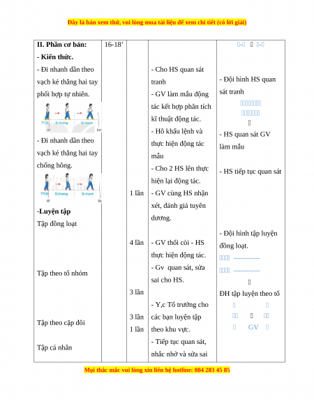II. Phần cơ bản: 16-18’ - - - Kiến thức. - Đi nhanh dần theo - Cho HS quan sát vạch kẻ thẳng hai tay tranh - Đội hình HS quan phối hợp tự nhiên. - GV làm mẫu động sát tranh tác kết hợp phân tích kĩ thuật động tác. - Hô khẩu lệnh và - HS quan sát GV - Đi nhanh dần theo thực hiện động tác làm mẫu vạch kẻ thẳng hai tay mẫu chống hông. - Cho 2 HS lên thực - HS tiếp tục quan sát hiện lại động tác. 1 lần - GV cùng HS nhận xét, đánh giá tuyên -Luyện tập dương. Tập đồng loạt - Đội hình tập luyện 4 lần - GV thổi còi - HS đồng loạt. thực hiện động tác. ----------- - Gv quan sát, sửa Tập theo tổ nhóm ----------- sai cho HS. 3 lần ĐH tập luyện theo tổ - Y,c Tổ trưởng cho