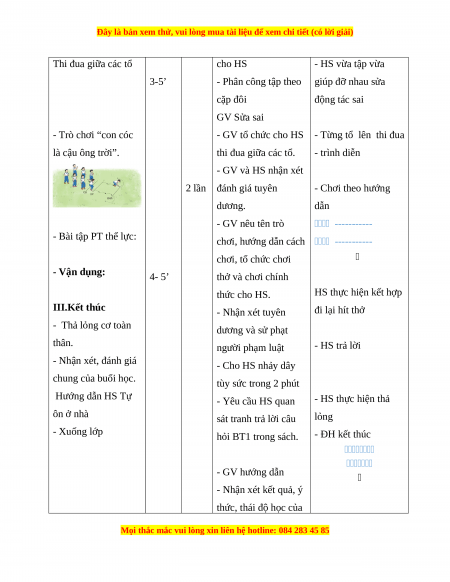 chơi, hướng dẫn cách ----------- chơi, tổ chức chơi - Vận dụng: 4- 5’ thở và chơi chính thức cho HS. HS thực hiện kết hợp III.Kết thúc - Nhận xét tuyên đi lại hít thở - Thả lỏng cơ toàn dương và sử phạt thân. người phạm luật - HS trả lời - Nhận xét, đánh giá - Cho HS nhảy dây chung của buổi học. tùy sức trong 2 phút Hướng dẫn HS Tự - Yêu cầu HS quan - HS thực hiện thả ôn ở nhà sát tranh trả lời câu lỏng - Xuống lớp hỏi BT1 trong sách. - ĐH kết thúc - GV hướng dẫn - Nhận xét kết quả, ý