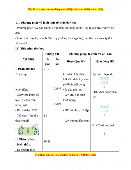- Phương pháp dạy học chính: Làm mẫu, sử dụng lời nói, tập luyện, trò chơi và thi đấu.
