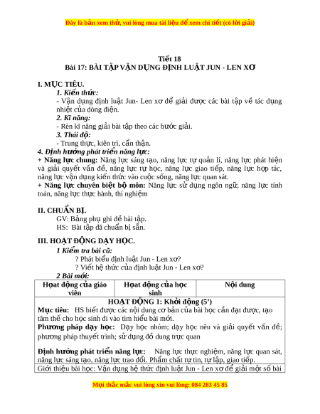Bài 17: BÀI TẬP VẬN D N Ụ G Đ N Ị H LU T Ậ JUN - LEN XƠ I. M C Ụ TIÊU. 1. Ki n ế th c: ứ - V n ậ d ng ụ đ nh ị lu t ậ Jun- Len xơ để gi i ả đư c ợ các bài t p ậ về tác d ng ụ nhiệt c a dòng đi ủ ện. 2. Kĩ năng: - Rèn kĩ năng gi i ả bài t p t ậ heo các bư c ớ gi i ả . 3. Thái đ : ộ - Trung th c, ự kiên trì, c n t ẩ h n. ậ 4. Đ nh h ị ư ng phát ớ tri n năng l ể c: ự + Năng l c ự chung: Năng l c ự sáng t o, ạ năng l c ự tự qu n ả lí, năng l c ự phát hi n ệ và gi i ả quy t ế v n ấ đ , ề năng l c ự tự h c, ọ năng l c ự giao ti p, ế năng l c ự h p ợ tác, năng l c ự v n d ậ ng ki ụ n t ế h c ứ vào cu c s ộ ng, ố năng l c quan s ự át. + Năng l c ự chuyên bi t