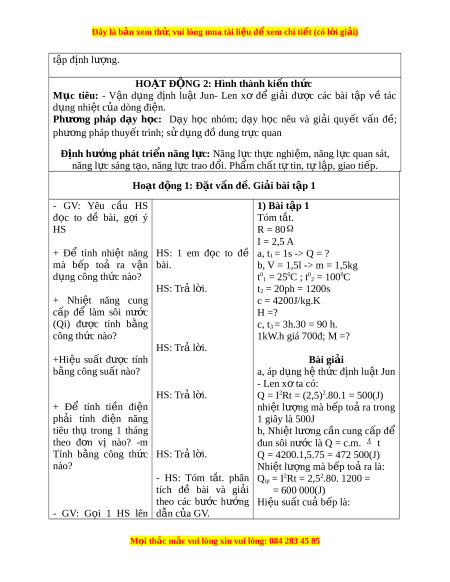 Ộ G 2: Hình thành ki n t ế h c ứ Mục tiêu: - V n ậ d ng ụ đ nh ị lu t ậ Jun- Len xơ để gi i ả đư c ợ các bài t p ậ về tác d ng nhi ụ ệt c a ủ dòng đi n. ệ Phư ng ơ pháp d y ạ h c: ọ D y ạ h c ọ nhóm; d y ạ h c ọ nêu và gi i ả quy t ế v n ấ đề; phư ng ơ pháp thuy t ế trình; s d ử ng đ ụ ồ dung tr c ự quan Đ nh h ị ư ng ớ phát tri n năng l ể c ự : Năng l c t ự h c nghi ự m ệ , năng l c quan s ự át, năng l c s ự áng t o, năng l ạ c ự trao đ i ổ . Ph m ẩ ch t ấ t t ự in, t l ự p, ậ giao ti p. ế Hoạt đ ng 1: ộ Đ t ặ v n đ ấ . G ề i i ả bài t p 1 ậ - GV: Yêu c u ầ HS 1) Bài tập 1 đ c ọ to đề bài, g i ợ ý Tóm t t ắ . HS R = 80 I = 2,5 A + Để tính nhi t ệ năng HS: 1 em đ c