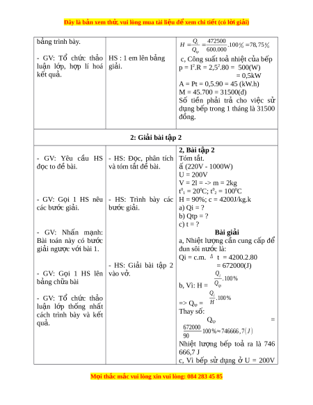 Đây là bản xem th , vu ử i lòng mua tài li u ệ đ xe ể m chi ti t (c ế ó l i ờ gi i ả ) b ng ả trình bày. Q 472500 i 0 0 H .100 7 8, 75 0 0 Q 600.000 tp - GV: Tổ ch c ứ th o ả HS : 1 em lên b ng ả c, Công suất toả nhi t ệ c a b ủ p ế lu n ậ l p, ớ h p ợ lí hoá gi i ả . p = I2.R = 2,52.80 = 500(W) k t ế qu . ả = 0,5kW A = Pt = 0,5.90 = 45 (kW.h) M = 45.700 = 31500(đ) Số ti n ề ph i ả trả cho vi c ệ sử d ng ụ b p ế trong 1 tháng là 31500 đồng.