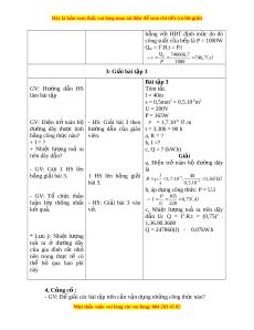 ệ trở toàn bộ - HS: Gi i ả bài 3 theo ρ = 1,7.10-8 .m đư ng ờ dây đư c ợ tính hư ng ớ d n ẫ c a ủ giáo t = 3.30h = 90 h b ng ằ công th c nào? ứ viên. a, R = ? + I = ? b, I =? + Nhi t ệ lư ng ợ toả ra c, Q = ? (kW.h) trên dây dẫn? Giải a, Đi n ệ trở toàn bộ đư ng ờ dây - GV: G i ọ 1 HS lên là b ng ả gi i ả bài 3. 1 HS lên b ng ả gi i ả l 40 8 R . 1 , 7.10 . 1 , 36 6 bài 3. s 0,5.10 b, áp d ng công t ụ h c: ứ P = U.I - GV: Tổ ch c ứ th o ả P 165 I 0 , 75 A lu n ậ l p ớ th ng ố nh t ấ - HS: Gi i ả bài 3 vào U 220 k t ế qu . ả v . ở c, Nhi t ệ lư ng ợ toả ra trên dây