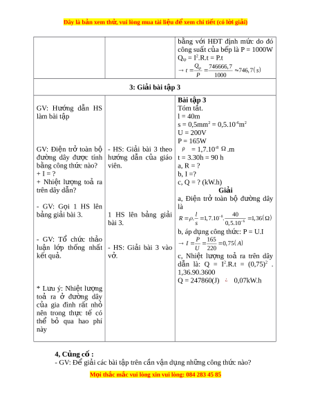 Đây là bản xem th , vu ử i lòng mua tài li u ệ đ xe ể m chi ti t (c ế ó l i ờ gi i ả ) b ng ằ v i ớ HĐT đ nh ị m c ứ do đó công suất c a ủ b p l ế à P = 1000W Qtp = I2.R.t = P.t Qtp 746666,7 t 74 6,7 s P 1000 3: Giải bài t p 3 ậ Bài t p 3 ậ GV: Hư ng ớ d n ẫ HS Tóm t t ắ . làm bài t p ậ l = 40m s = 0,5mm2 = 0,5.10-6m2 U = 200V P = 165W GV: Đi n