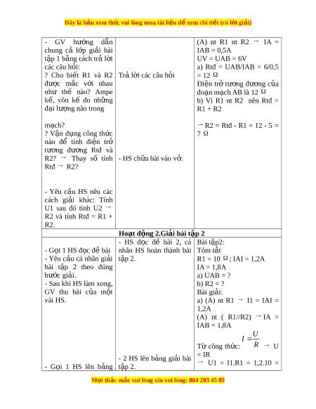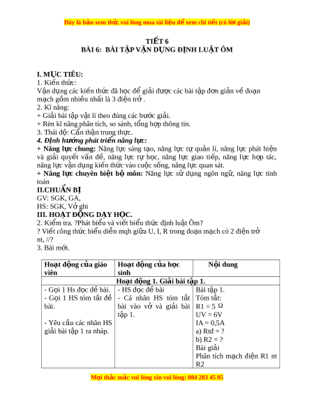 ệ bộ môn: Năng l c ự sử d ng ụ ngôn ng , ữ năng l c ự tính toán II.CHUẨN BỊ GV: SGK, GA, HS: SGK, V ghi ở III. HOẠT Đ N Ộ G D Y Ạ H C Ọ . 2. Ki m ể tra. ?Phát bi u và vi ể t ế bi u t ể h c ứ đ nh l ị u t ậ Ôm? ? Vi t ế công th c bi ứ u di ể n m ễ qh gi a U ữ , I, R trong đo n m ạ ạch có 2 đi n t ệ rở nt, //? 3. Bài m i ớ . Hoạt đ ng c ộ a g ủ iáo Hoạt đ ng c ộ a h ủ c ọ N i ộ dung viên sinh Hoạt đ ng 1. G ộ i i ả bài t p 1. ậ - G i ọ 1 Hs đ c đ ọ bài ề . - HS đ c đ ọ bài ề Bài t p ậ 1. - G i ọ 1 HS tóm t t