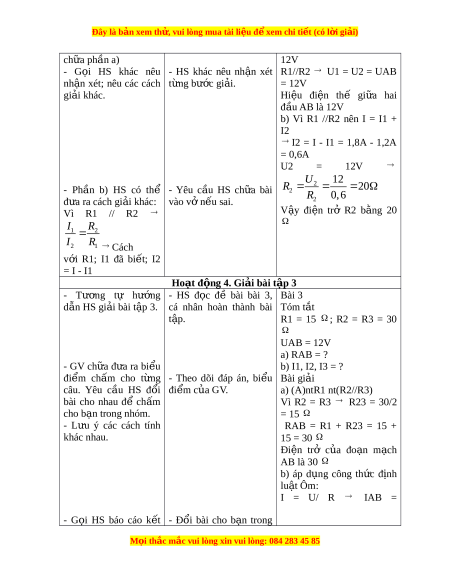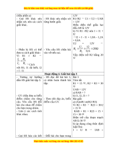 ậ xét; nêu các cách t ng b ừ ư c ớ gi i ả . = 12V gi i ả khác. Hiệu đi n ệ thế gi a ữ hai đầu AB là 12V b) Vì R1 //R2 nên I = I1 + I2 I2 = I - I1 = 1,8A - 1,2A = 0,6A U2 = 12V U 12 2 - Ph n ầ b) HS có thể - Yêu c u ầ HS ch a ữ bài R 2 0 2 R 0,6 đ a ư ra cách gi i ả khác: vào vở n u s ế ai. 2 Vì R1 // R2 V y ậ đi n ệ trở R2 b ng ằ 20 I R 1 2 I R 2 1 Cách v i ớ R1; I1 đã bi t ế ; I2 = I - I1 Hoạt đ ng 4. G ộ i i ả bài t p 3 ậ - Tư ng ơ tự hư ng ớ - HS đ c ọ đề bài bài 3, Bài 3 dẫn HS gi i ả bài t p