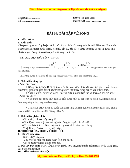 Ngày soạn …………………… BÀI 14: BÀI T P Ậ V SÓ Ề NG I. MỤC TIÊU 1. Ki n ế th c ứ - T ph ừ ư ng ơ trình sóng hoặc đ t ồ h m ị ô t hì ả nh nh c ả a ủ sóng t i ạ m t ộ th i ờ đi m ể xét. Xác đ nh ị đư c ợ các đại lư ng b ợ ư c ớ sóng , biên đ , t ộ ần s , t ố ốc đ , c ộ ư ng đ ờ s ộ óng và mô tả đư c ợ tính chất chuyển đ ng c ộ a ủ m t ộ s ph ố ần t s ử óng cho trước. - Vận d ng đ ụ ư c ợ bi u t ể h c ứ v= λ.f = λ/T D D D i k (k 0,5) - Vận d ng ụ đ c ượ các bi u ể th c ứ a , x a a s = , xt = cho giao thoa ánh sáng qua hai khe h p. ẹ - Vận d ng ụ đ c ượ đi u ề ki n ệ đ ể có sóng d ng ừ trên dây xác đ nh ị các đ i ạ l ng ượ v,f, λ. 2. Phát tri n ể năng l c ự - Năng l c ự chung: + Năng lực tự h c ọ :Biết tự tìm hi u ể l i ạ các ki n ế th c ứ đã h c ọ , tự giác chu n ẩ bị các nhi m