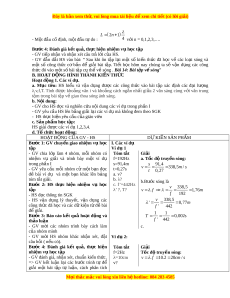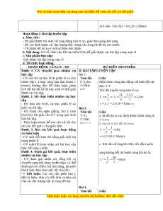 HS giải được các ví dụ 1,2,3,4. d. T c ổ h c ứ ho t đ ạ n ộ g: HOẠT Đ N Ộ G C A Ủ GV - HS D K Ự IẾN SẢN PH M Ẩ Bư c ớ 1: GV chuy n ể giao nhi m ệ v h ụ c ọ I. Các ví dụ t p ậ Ví d 1 ụ - GV chia l p ớ làm 4 nhóm, m i ỗ nhóm có Tóm tắt Giải nhi m ệ vụ gi i ả và trình bày m t ộ ví dụ f=192Hz a. T c ố đ tr ộ uy n ề sóng: trong phần I s=91,4m s 91, 4 - GV yêu c u ầ m i ỗ nhóm cử m t ộ b n ạ đ c ọ t=0,27s v 338 ,5m / s t 0, 27 đề bài ví dụ và m t ộ b n ạ khác lên b ng ả a. v? tóm tắt giải. b. λ? b.Bư c ớ sóng là Bư c ớ 2: HS th c ự hi n ệ nhi m ệ vụ h c ọ c. f’=442Hz v 338,5 t p ậ λ’ ?, T? v . f 1 , 76m - HS đ c ọ thông tin SGK f 192 - HS v n ậ d ng ụ lý thuy t ế , v n ậ d ng ụ các v 338,5 ' 0 , 77m công th c ứ đã h c ọ và các d ki ữ n ệ t đ ừ ề bài f ' 442 để giải. 1 1 Bư c ớ 3: Báo cáo k t ế quả ho t ạ đ n ộ g và T 0 , 002s thảo luận f ' 442 - GV m i