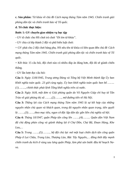 c. Sản phẩm: Từ khóa về chủ đề Cách mạng tháng Tám năm 1945. Chiến tranh giải