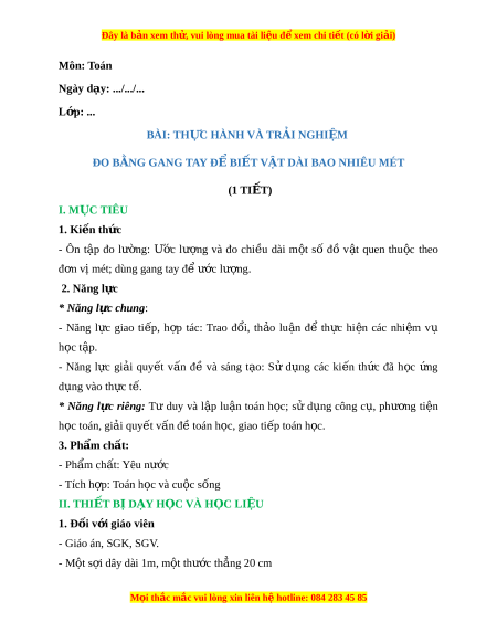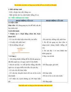 ự riêng: Tư duy và l p ậ lu n ậ toán h c; ọ sử d ng ụ công c , ụ phư ng ơ ti n ệ h c ọ toán, gi i ả quy t ế v n đ ấ t ề oán h c, ọ giao ti p t ế oán h c. ọ 3. Phẩm ch t ấ : - Ph m ẩ ch t ấ : Yêu nư c ớ - Tích h p: ợ Toán h c và cu ọ c ộ s ng ố II. THIẾT B D Ị ẠY H C Ọ VÀ H C Ọ LI U Ệ 1. Đ i ố v i ớ giáo viên - Giáo án, SGK, SGV. - M t ộ s i ợ dây dài 1m, m t ộ thư c ớ th ng 20 cm ẳ M i