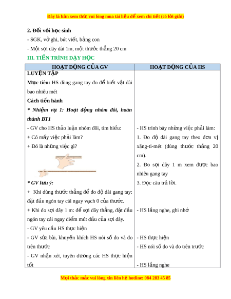 Đây là bản xem th , vu ử i lòng mua tài li u ệ đ xe ể m chi ti t (c ế ó l i ờ gi i ả ) 2. Đ i ố v i ớ h c s ọ inh - SGK, v ghi ở , bút vi t ế , b ng con ả - M t ộ s i ợ dây dài 1m, m t ộ thư c ớ th ng 20 cm ẳ III. TI N Ế TRÌNH D Y Ạ H C Ọ HOẠT Đ N Ộ G C A Ủ GV HOẠT Đ N Ộ G C A Ủ HS LUYỆN TẬP