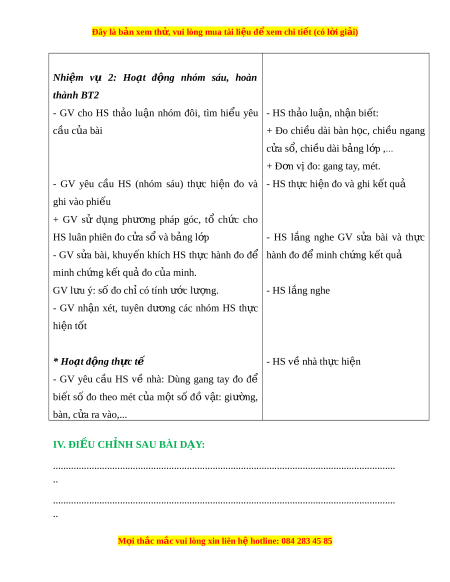nhóm sáu, hoàn thành BT2 - GV cho HS th o ả lu n ậ nhóm đôi, tìm hi u ể yêu - HS th o l ả u n, ậ nh n bi ậ t ế : cầu c a ủ bài + Đo chi u ề dài bàn h c, ọ chi u ề ngang c a ử sổ, chi u dài ề b ng ả l p , ớ ... + Đ n ơ v đo: ị gang tay, mét. - GV yêu c u ầ HS (nhóm sáu) th c ự hi n ệ đo và - HS th c hi ự n đo và ghi ệ k t ế qu ả ghi vào phi u ế + GV sử d ng ụ phư ng ơ pháp góc, tổ ch c ứ cho HS luân phiên đo c a ử s và b ổ ng ả l p ớ - HS l ng ắ nghe GV s a ử bài và th c ự - GV s a ử bài, khuy n ế khích HS th c