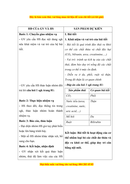 c) Sản phẩm: Khái niệm, vai trò, cơ quan của hệ bài tiết, đáp án câu 1 sgk trang 81. d) Tổ chức thực hiện