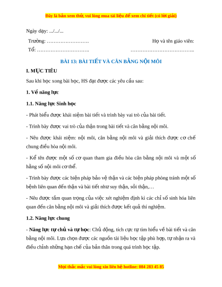 ……………………………….. BÀI 13: BÀI TI T Ế VÀ CÂN B N Ằ G N I Ộ MÔI I. M C Ụ TIÊU Sau khi h c ọ xong bài h c, H ọ S đ t ạ được các yêu c u s ầ au: 1. V năng l ề c ự 1.1. Năng l c Si ự nh h c ọ - Phát bi u đ ể ư c khái ợ ni m ệ bài ti t