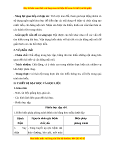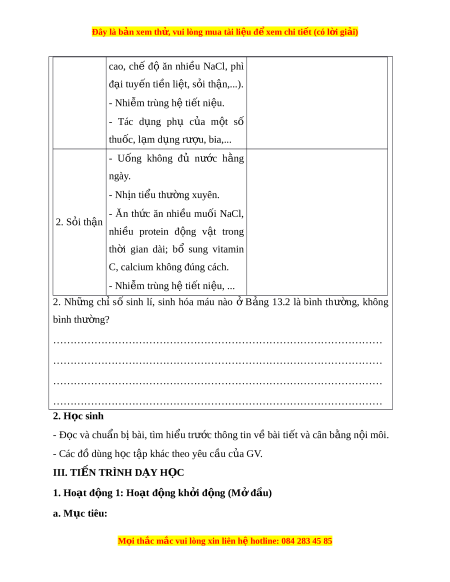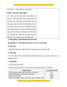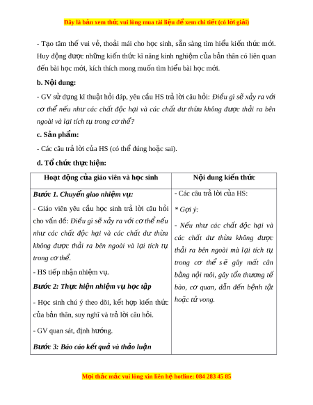 Đây là bản xem th , vu ử i lòng mua tài li u ệ đ xe ể m chi ti t (c ế ó l i ờ gi i ả ) - T o ạ tâm thế vui v , ẻ tho i ả mái cho h c ọ sinh, s n ẵ sàng tìm hi u ể ki n ế th c ứ m i ớ . Huy đ ng ộ đư c ợ nh ng ữ ki n ế th c ứ kĩ năng kinh nghi m ệ c a ủ b n ả thân có liên quan đ n bài ế h c m ọ i ớ , kích thích mong mu n t ố ìm hi u bài ể h c m ọ i ớ . b. N i ộ dung: - GV s ử d ng kĩ ụ thu t ậ h i ỏ đáp, yêu c u H ầ S tr ả l i ờ câu h i ỏ : Đi u gì ề s ẽ x y ả ra v i ớ cơ thể n u ế như các ch t ấ đ c ộ h i ạ và các ch t ấ dư th a ừ không đư c ợ th i ả ra bên ngoài và l i ạ tích t t ụ rong c t ơ h ? ể c. Sản phẩm: - Các câu trả l i ờ c a ủ HS (có th đúng ho ể c ặ sai). d. T ch ổ ức thực hi n: ệ Hoạt đ ng c ộ a gi ủ áo viên và h c s ọ inh N i ộ dung ki n t ế h c ứ Bư c ớ 1. Chuy n gi ể ao nhi m ệ v : ụ - Các câu trả l i ờ c a ủ HS: - Giáo viên yêu c u ầ h c ọ sinh trả l i ờ câu h i ỏ * G i ợ ý: cho vấn đề: Đi u ề gì sẽ x y ả ra v i ớ c t ơ h ể n u ế - N u ế như các ch t ấ đ c ộ h i ạ và như các ch t ấ đ c ộ h i ạ và các ch t ấ dư th a ừ các ch t ấ dư th a ừ không đư c ợ không đư c ợ th i