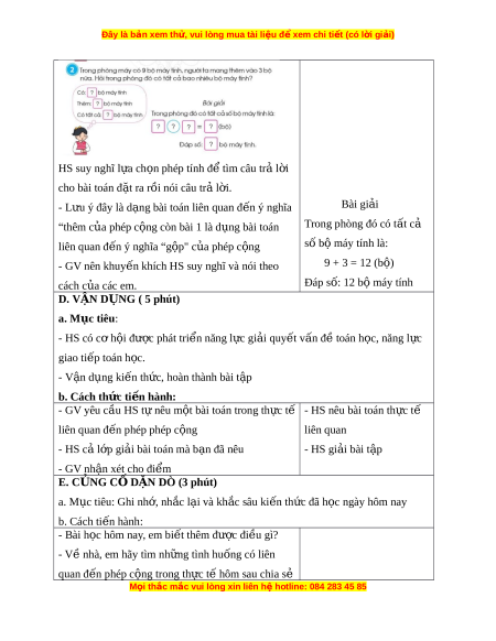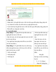 ờ văn liên quan đ n phép c ế ng, phép t ộ rừ - Phát tri n các ể năng l c ự toán h c. ọ b. Cách ti n h ế ành: Hoạt đ ng 1 ộ . GV giúp HS ôn l i ạ ti n ế trình suy - HS ôn l i ạ ti n ế trình suy nghĩ gi i ả bài toán có l i ờ văn: nghĩ gi i ả bài toán có l i ờ - Đ c bài ọ toán, nói cho b n nghe bài ạ toán cho bi t ế văn: gì, bài toán h i ỏ gì. - Đ c ọ bài toán, nói cho - Suy nghĩ l a ch ự n phép t ọ ính đ t ể ìm câu tr l ả i ờ b n nghe: ạ bài toán cho cho bài toán đ t ặ ra. bi t ế gì, bài toán h i ỏ gì? Hoạt đ ng 2 ộ . GV gi i ớ thi u t ệ hao tác m i ớ trong - Suy nghĩ l a ch ự n ọ phép ti n t ế rình gi i ả bài toán có l i ờ văn, đó là vi t ế bài tính đ t ể ìm câu tr l ả i ờ cho gi i ả c a bài ủ toán, cụ th : ể bài toán đ t ặ ra. + Vi t ế câu l i ờ gi i ả Mẫu: + Vi t ế phép tính Bài gi i ả + Vi t ế đáp s . ố Hai b n có ạ tất cả số bông hoa là: 5 + 4 = 9 ( bông ) Đáp số: 9 bông hoa Mọi th c ắ m c