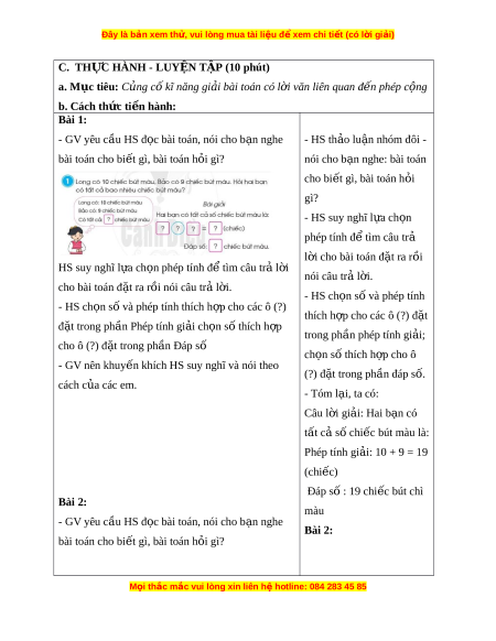 ờ văn liên quan đ n ế phép c ng ộ b. Cách th c ứ ti n hàn ế h: Bài 1: - GV yêu cầu HS đ c bài ọ toán, nói cho b n ạ nghe - HS th o ả lu n nhóm ậ đôi - bài toán cho bi t ế gì, bài toán h i ỏ gì? nói cho b n nghe: ạ bài toán cho bi t ế gì, bài toán h i ỏ gì? - HS suy nghĩ l a ch ự n ọ phép tính đ t ể ìm câu tr ả l i ờ cho bài toán đ t ặ ra rồi HS suy nghĩ l a ch ự n phép t ọ ính đ t ể ìm câu tr l ả i ờ nói câu tr l ả i ờ . cho bài toán đ t ặ ra r i ồ nói câu tr l ả i ờ . - HS ch n ọ số và phép tính - HS ch n s ọ và ố