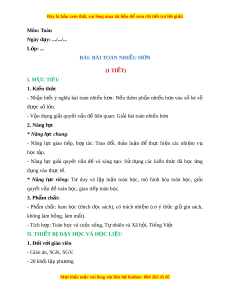 Ngày dạy: .../.../... L p: ớ ... BÀI: BÀI TOÁN NHI U Ề H N Ơ (1 TIẾT) I. M C Ụ TIÊU 1. Ki n t ế h c ứ - Nh n ậ bi t ế ý nghĩa bài toán nhi u ề h n: ơ N u ế thêm ph n ầ nhi u ề h n ơ vào s ố bé sẽ đư c ợ số l n. ớ - V n ậ d ng gi ụ i ả quy t ế v n đ ấ l ề iên quan: Gi i ả bài toán nhi u h ề n ơ 2. Năng l c ự