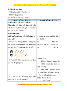 ự riêng: Tư duy và l p ậ lu n ậ toán h c, ọ mô hình hóa toán h c, ọ gi i ả quy t ế v n đ ấ t ề oán h c, ọ giao ti p t ế oán h c. ọ 3. Phẩm ch t ấ : - Ph m ẩ ch t ấ : ham h c ọ (thích đ c ọ sách), có trách nhi m ệ (có ý th c ứ giữ gìn sách, không làm h ng, ỏ làm m t ấ ). - Tích h p: ợ Toán h c và cu ọ c ộ s ng, ố T nhi ự ên và Xã h i ộ , Ti ng ế Vi t ệ II. THIẾT B D Ị ẠY H C Ọ VÀ H C Ọ LI U Ệ 1. Đ i ố v i ớ giáo viên - Giáo án, SGK, SGV. - 20 kh i ố l p ậ phư ng ơ M i