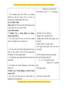 ộ số HS lên trình bày Số sách ngăn d ở ư i ớ là: bài gi i ả 9 + 3 = 12 (quy n s ể ách) Đáp s : ố 12 quy n ể - GV nh n ậ xét, tuyên dư ng ơ các HS th c ự sách hiện tốt - HS l ng nghe ắ Nhi m ệ vụ 2: Ho t ạ đ ng