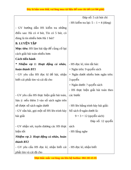 Đây là bản xem th , vu ử i lòng mua tài li u ệ đ xe ể m chi ti t (c ế ó l i ờ gi i ả ) 2. Đ i ố v i ớ h c s ọ inh - SGK, v ghi ở , bút vi t ế , b ng con ả - 10 kh i ố l p ậ phư ng ơ III. TI N Ế TRÌNH D Y Ạ H C Ọ HOẠT Đ N Ộ G C A Ủ GV HOẠT Đ N Ộ G C A Ủ HS A. BÀI H C Ọ VÀ TH C Ự HÀNH Mục tiêu: HS nh n ậ bi t ế dư c ợ bài toán về nhi u ề h n, ơ bi t ế cách gi i ả và trình bày bài gi i ả c a bài ủ toán đó Cách ti n hà ế nh: Gi i ớ thi u