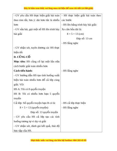 ộ số HS lên trình bày Xe c u h ứ a dài ỏ là: bài gi i ả 8 + 5 = 13 (cm) Đáp số: 13 cm - HS l ng nghe ắ - GV nh n ậ xét, tuyên dư ng ơ các HS th c ự hiện tốt D. C N Ủ G CỐ Mục tiêu: HS c ng ủ cố l i ạ m t ộ l n ầ n a ữ cách bư c gi ớ i ả toán nhi u h ề n ơ Cách ti n hà ế nh: - HS l ng nghe ắ - GV hư ng ớ d n ẫ HS t o ạ tình hu ng ố xu t ấ hiện bài toán nhi u ề h n ơ để cả l p ớ cùng gi i ả . VD: HS A: Tôi có 8 quy n t ể ruy n ệ HS B: Tôi có nhi u ề h n ơ b n ạ 5 quy n ể truy n ệ C l ả p: ớ Số quy n t ể ruy n b ệ n ạ B có là: - HS c l ả p ớ th c hi ự n ệ 8 + 5 = 13 (quy n t ể ruy n) ệ - HS l ng nghe ắ Đáp số: 13 quy n t ể ruy n ệ - GV yêu c u ầ HS cả l p ớ t o ạ các tình huống tư ng t ơ ví ự d và ụ gi i ả - GV nh n ậ xét, đánh giá k t ế qu , ả thái độ h c ọ t p c ậ a ủ HS. M i