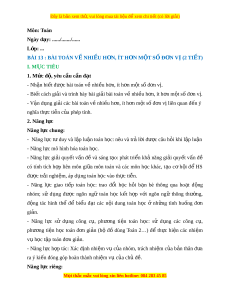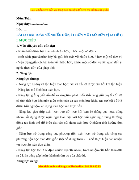 ọ thắc mắc vui lòng xin liên hotline: 084 283 45 85 Đây là bản xem th , vui ử lòng mua tài li u ệ đ xe ể m chi ti t ế (có l i ờ gi i ả ) Thông qua ho t ạ đ ng ộ gi i ả bài toán th c ự tế về nhi u ề h n, ơ ít h n ơ m t ộ số đ n ơ vị (phân tích đ , ể trình bày cách gi i ả , nói, vi t ế , di n ễ đ t ạ ), HS đư c ợ phát tri n ể năng l c ự giao ti p ế và năng l c gi ự i ả quy t ế v n đ ấ t ề oán h c. ọ 3. Phẩm ch t ấ - Rèn luy n t ệ ính c n t ầ h n, chí ậ nh xác. - Chăm chỉ tích c c ự xây d ng ự bài, chú ý l ng ắ nghe, đ c, ọ làm bài t p, ậ v n ậ d ng ụ ki n t ế h c ứ vào th c t ự i n d ễ ư i ớ s h ự ư ng d ớ n c ẫ a ủ giáo viên. - Yêu thích môn h c, ọ sáng t o, ạ có ni m ề h ng