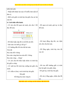 ầ 1 HS - HS quan sát tranh, giơ tay và đ c ọ đ c đ ọ t ề oán. đ t ề oán. - HS th o ả lu n c ậ p ặ đôi và tr l ả i ờ câu h i ỏ : - HS ho t ạ đ ng ộ c p ặ đôi, xác đ nh ị “ Bài toán cho bi t ế gì, h i ỏ gì?” yêu cầu c a bài ủ toán. - GV hư ng d ớ ẫn HS tóm t t ắ bài toán: Tóm t t ắ - HS l ng ắ nghe, trình bày tóm t t ắ Hoa màu đ : ỏ 6 bông vào v . ở Hoa màu vàng h n ơ hoa màu đ : ỏ 3 bông. Hoa màu vàng: ... bông? - GV yêu c u ầ HS th o ả lu n ậ nhóm và trình bày bài gi i ả ra nháp. - GV m i ờ hai HS trình bày mi ng ệ bài gi i ả c a ủ - HS trao đ i ổ hư ng ớ gi i ả và trình mình. bày bài gi i ả vào gi y nháp. ấ - GV ch a ữ và l u ý cách t ư rình bày bài gi i ả : - HS gi t ơ ay, trình bày bài gi i ả . Bài gi i ả Số bông hoa màu vàng là: - HS chú ý l ng ắ nghe, ch nh ỉ s a ử l i ỗ sai. M i