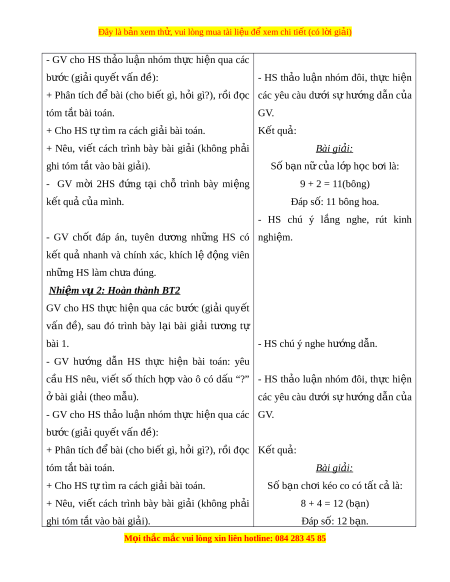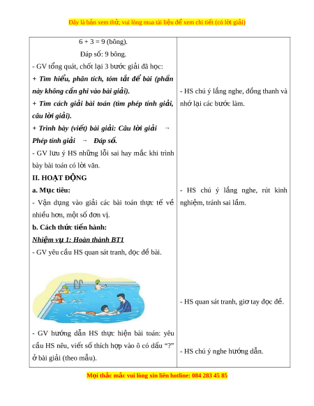 ọ thắc mắc vui lòng xin liên hotline: 084 283 45 85 Đây là bản xem th , vui ử lòng mua tài li u ệ đ xe ể m chi ti t ế (có l i ờ gi i ả ) 6 + 3 = 9 (bông). Đáp số: 9 bông. - GV tổng quát, ch t ố l i ạ 3 bư c gi ớ i ả đã h c: ọ + Tìm hi u,