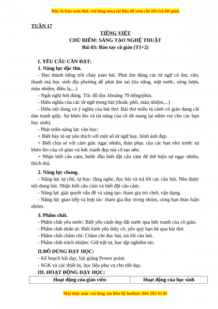 Bài 03: Bàn tay cô giáo (T1+2) I. YÊU CẦU CẦN ĐẠT: 1. Năng lực đặc thù.