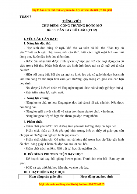 Bài 13: BÀN TAY CÔ GIÁO (T1+2) I. YÊU CẦU CẦN ĐẠT: 1. Năng lực đặc thù.