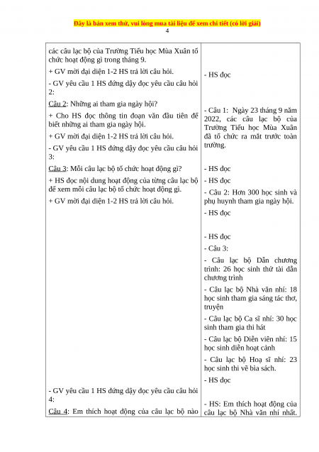 Câu 4: Em thích hoạt động của câu lạc bộ nào