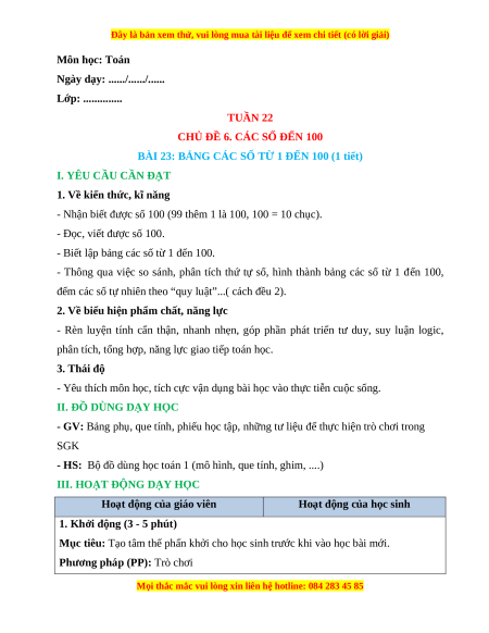 BÀI 23: BẢNG CÁC SỐ TỪ 1 ĐẾN 100 (1 tiết)