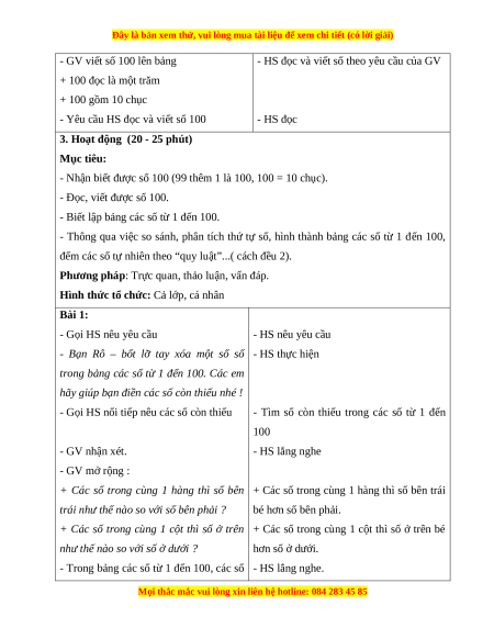 - Thông qua việc so sánh, phân tích thứ tự số, hình thành bảng các số từ 1 đến 100,