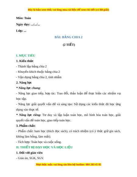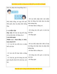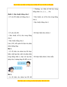 Ngày dạy: .../.../... L p: ớ ... BÀI: BẢNG CHIA 2 (2 TIẾT) I. M C Ụ TIÊU 1. Ki n t ế h c ứ - Thành l p b ậ ng ả chia 2 - Khuy n khí ế ch thu c ộ b ng chi ả a 2 - V n ậ d ng b ụ ng ả chia 2, tính nh m ẩ 2. Năng l c ự