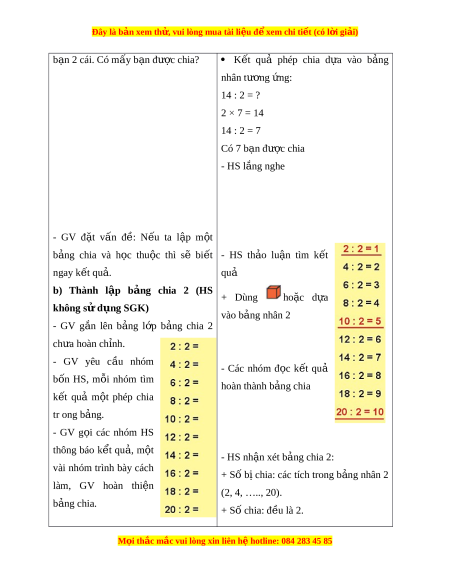 Đây là bản xem th , vu ử i lòng mua tài li u ệ đ xe ể m chi ti t (c ế ó l i ờ gi i ả ) b n ạ 2 cái. Có mấy b n ạ đư c chi ợ a? K t ế quả phép chia d a ự vào b ng ả nhân tư ng ơ ng: ứ 14 : 2 = ? 2 × 7 = 14 14 : 2 = 7 Có 7 b n đ ạ ư c ợ chia - HS l ng nghe ắ - GV đ t ặ v n ấ đ : ề N u ế ta l p ậ m t ộ b ng ả chia và h c ọ thu c ộ thì sẽ bi t ế - HS th o ả lu n ậ tìm k t ế ngay k t ế qu . ả quả b) Thành l p ậ b ng ả