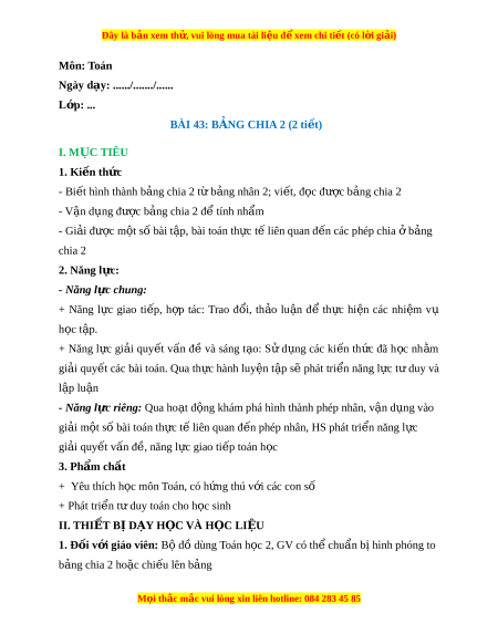 BÀI 43: BẢNG CHIA 2 (2 ti t ế ) I. M C Ụ TIÊU 1. Ki n t ế h c ứ - Bi t ế hình thành b ng ả chia 2 t b ừ ng ả nhân 2; vi t ế , đ c đ ọ ư c ợ b ng chi ả a 2 - V n ậ d ng đ ụ ư c ợ b ng chi ả a 2 để tính nh m ẩ - Gi i ả đư c ợ m t ộ s bài ố t p, ậ bài toán th c t ự l ế iên quan đ n các ế phép chia b ở ng ả chia 2 2. Năng l c: ự - Năng l c ự chung: + Năng l c ự giao ti p, ế h p ợ tác: Trao đ i ổ , th o ả lu n ậ để th c ự hi n ệ các nhi m ệ vụ h c ọ t p. ậ + Năng l c ự gi i ả quy t ế v n ấ đ ề và sáng t o: ạ S ử d ng ụ các ki n ế th c ứ đã h c ọ nh m ằ gi i ả quy t