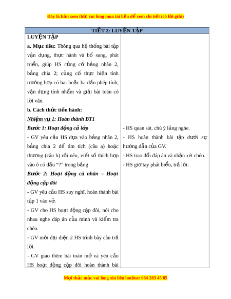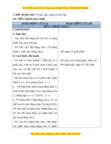 Đây là bản xem th , vu ử i lòng mua tài li u ệ đ xe ể m chi ti t (c ế ó l i ờ gi i ả ) 2. Đ i ố v i ớ h c s ọ inh: V ghi ở , sgk, d ng c ụ h ụ c t ọ p. ậ III. TI N Ế TRÌNH D Y Ạ H C Ọ HOẠT Đ N Ộ G C A Ủ GV HOẠT Đ N Ộ G C A Ủ HS TIẾT 1: BẢNG CHIA 2 I. KHÁM PHÁ a. Mục tiêu: - T o ạ tâm thế h ng ứ thú cho HS và t ng ừ bư c ớ làm quen bài h c. ọ - HS bi t ế cách l p ậ b ng ả chia 2 từ b ng ả nhân 2, vi t ế , đ c ọ b ng chi ả a 2 - HS nghe GV gi i ớ thi u ệ b. Cách th c ứ ti n hàn ế h: