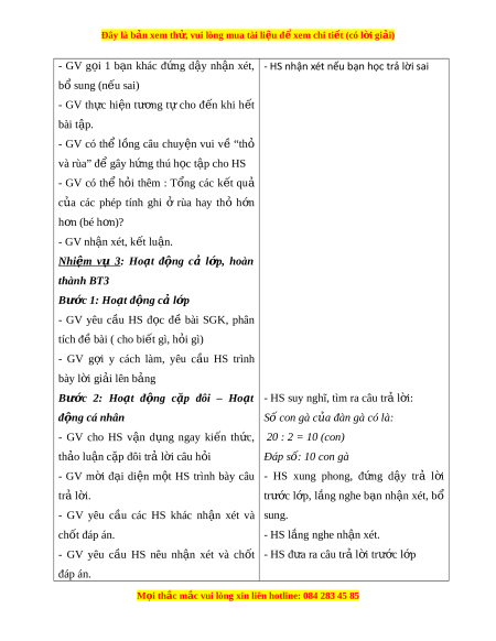 Số con gà c a đàn gà có l ủ à: - GV cho HS v n ậ d ng ụ ngay ki n ế th c, ứ 20 : 2 = 10 (con) th o ả lu n c ậ p ặ đôi tr l ả i ờ câu h i ỏ Đáp số: 10 con gà - GV m i ờ đ i ạ di n ệ m t