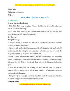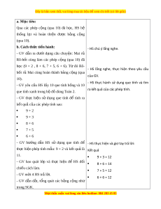 Ộ G (QUA 10) (2 TIẾT) I. M C Ụ TIÊU 1. Mức đ , ộ yêu c u c ầ n đ ầ t ạ - Hình thành đư c ợ b ng ả c ng ộ (qua 10) qua vi c ệ h ệ th ng ố l i ạ các phép c ng ộ (qua 10) đã h c t ọ hành m t ộ b ng. ả - V n ậ d ng ụ b ng ả c ng ộ (qua 10) vào tính nh m ẩ , gi i ả các bài t p ậ ho c ặ bài toán th c ự t l ế iên quan đ n phép c ế ng ộ (qua 10). 2. Năng l c ự Năng l c chung ự : - Năng l c t ự duy và ư l p l ậ u n t ậ oán h c: ọ nêu và tr l ả i ờ đư c ợ câu h i ỏ khi l p ậ lu n ậ - Năng l c m ự ô hình hóa toán h c. ọ - Năng l c ự gi i ả quy t ế v n ấ đ và ề sáng t o: ạ phát tri n ể kh ả năng gi i ả quy t ế v n ấ đề có tính tích h p ợ liên môn gi a
