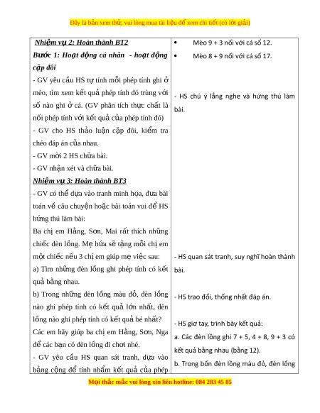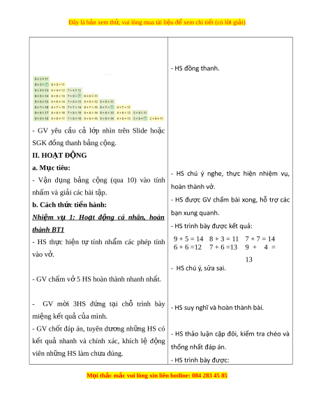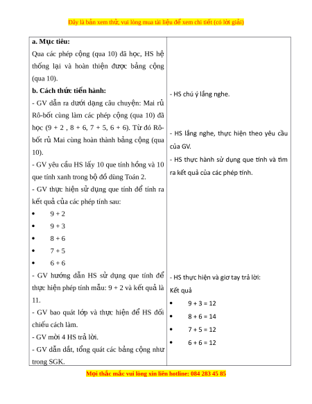 ọ thắc mắc vui lòng xin liên hotline: 084 283 45 85 Đây là bản xem th , vui ử lòng mua tài li u ệ đ xe ể m chi ti t ế (có l i ờ gi i ả ) a. Mục tiêu: Qua các phép c ng ộ (qua 10) đã h c, ọ HS hệ thống l i ạ và hoàn thi n ệ đư c ợ b ng ả c ng ộ (qua 10). b. Cách th c t ứ i n hành: ế - HS chú ý lắng nghe. - GV d n ẫ ra dư i ớ d ng ạ câu chuy n: ệ Mai rủ